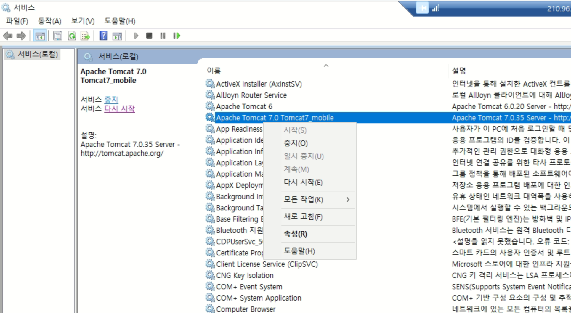1. 서비스 -> 톰캣 우클릭 -> 속성